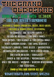 11.30am til late The Isis Rover Farmhouse Oxford Oxford & shires americana, blues, blue grass, country & roots finest featuring No Horses/The Autumn Saints /Beard Of Destiny / The Holy Fools / Mojo Demon / Des Barkus & The Lovell Dogs / Scott Gordon Band / The Long Harvest / Franklins Tower / Tony Batey / Journeyman / Headington Hillbillies / Pete Fryer Band /The Faith Healers / Firegazer /Edwin & The Keepers / Microlights / Only The Brave / Osmosis / Barton Hartshorn / The Still Cans .. food & full bar served all day early bird tickets on sale now: tickets